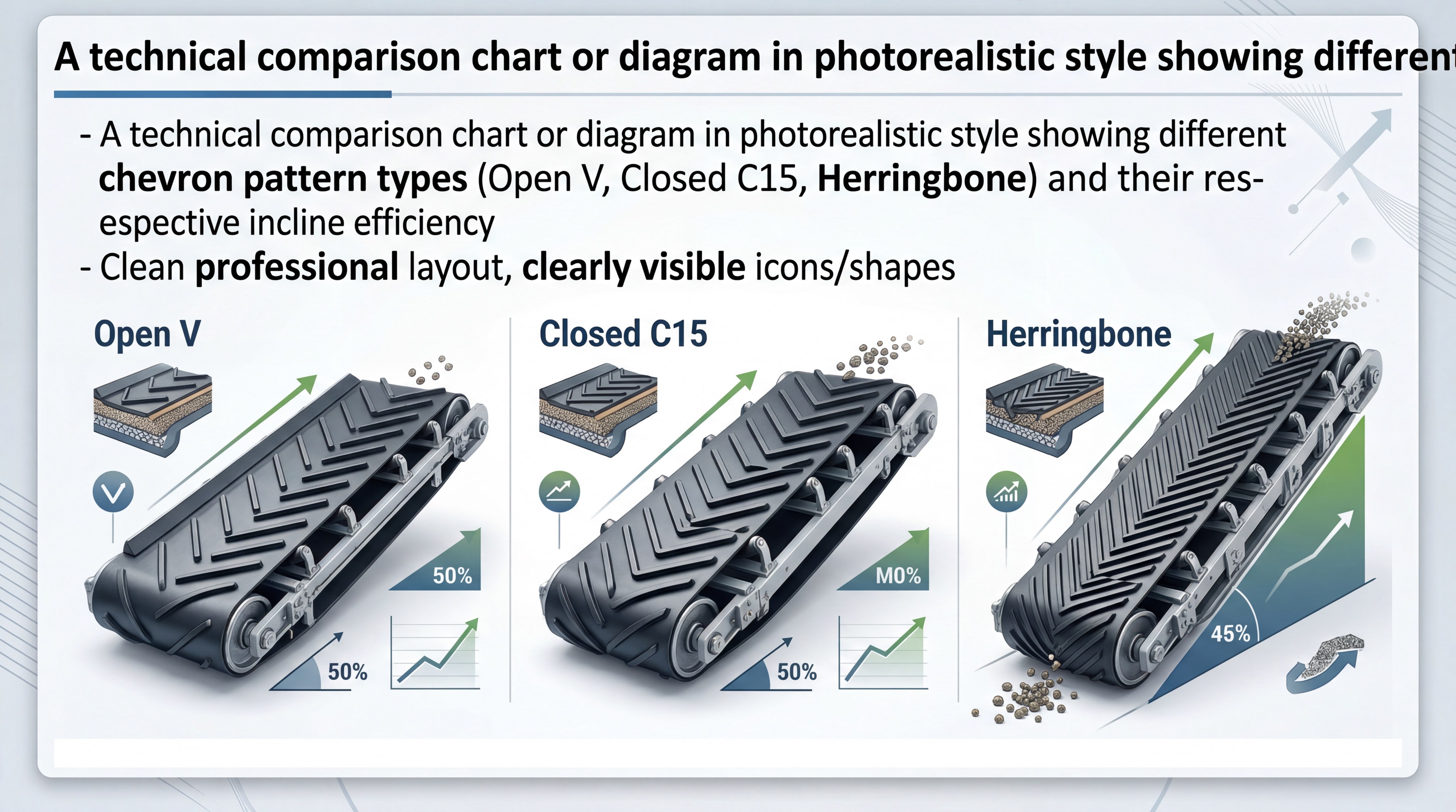 The incline angle determines the height and type of pattern required for your specific profiled herringbone rubber conveyor belt system. As the angle increases, gravity acts more forcefully on the plaster, necessitating deeper “V” patterns to maintain stability.