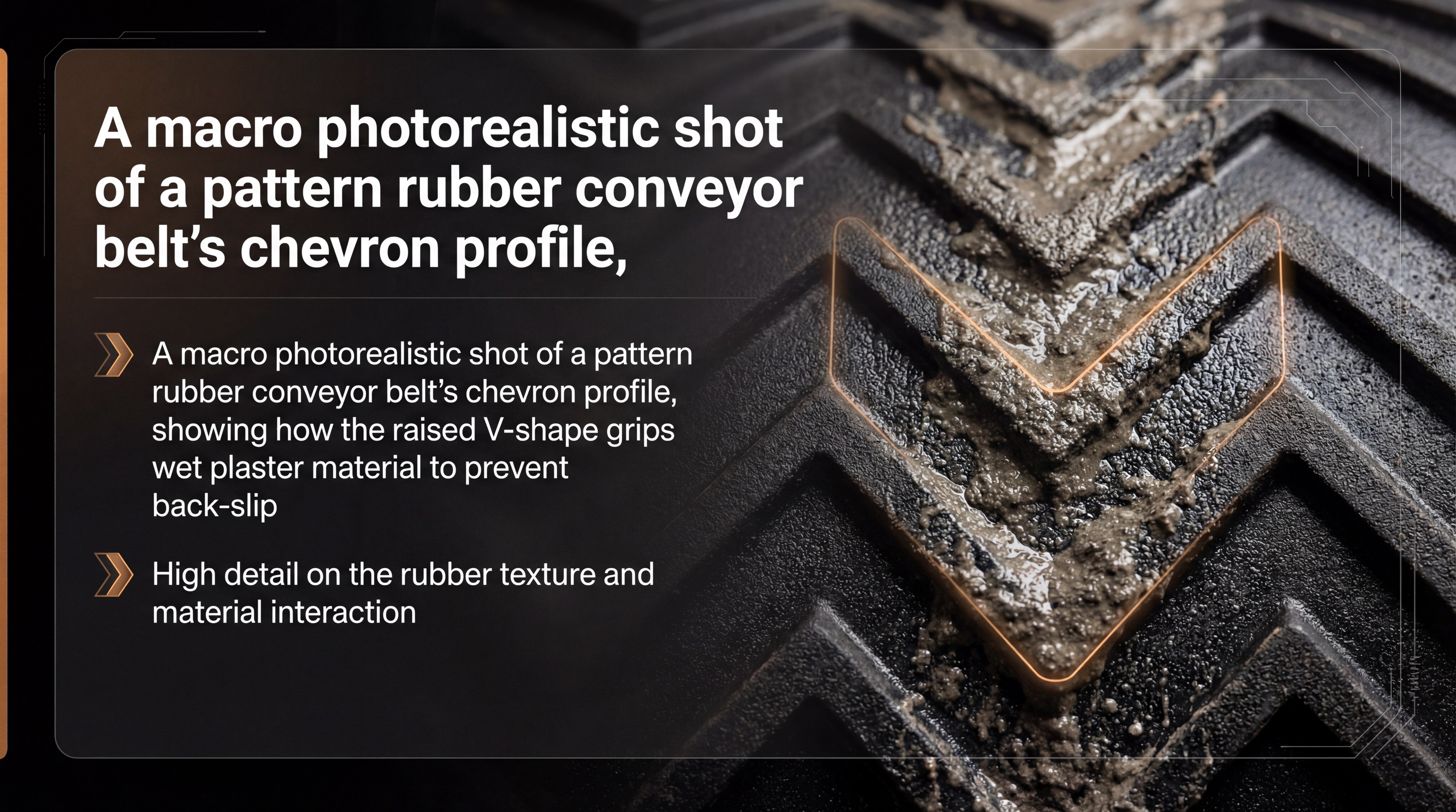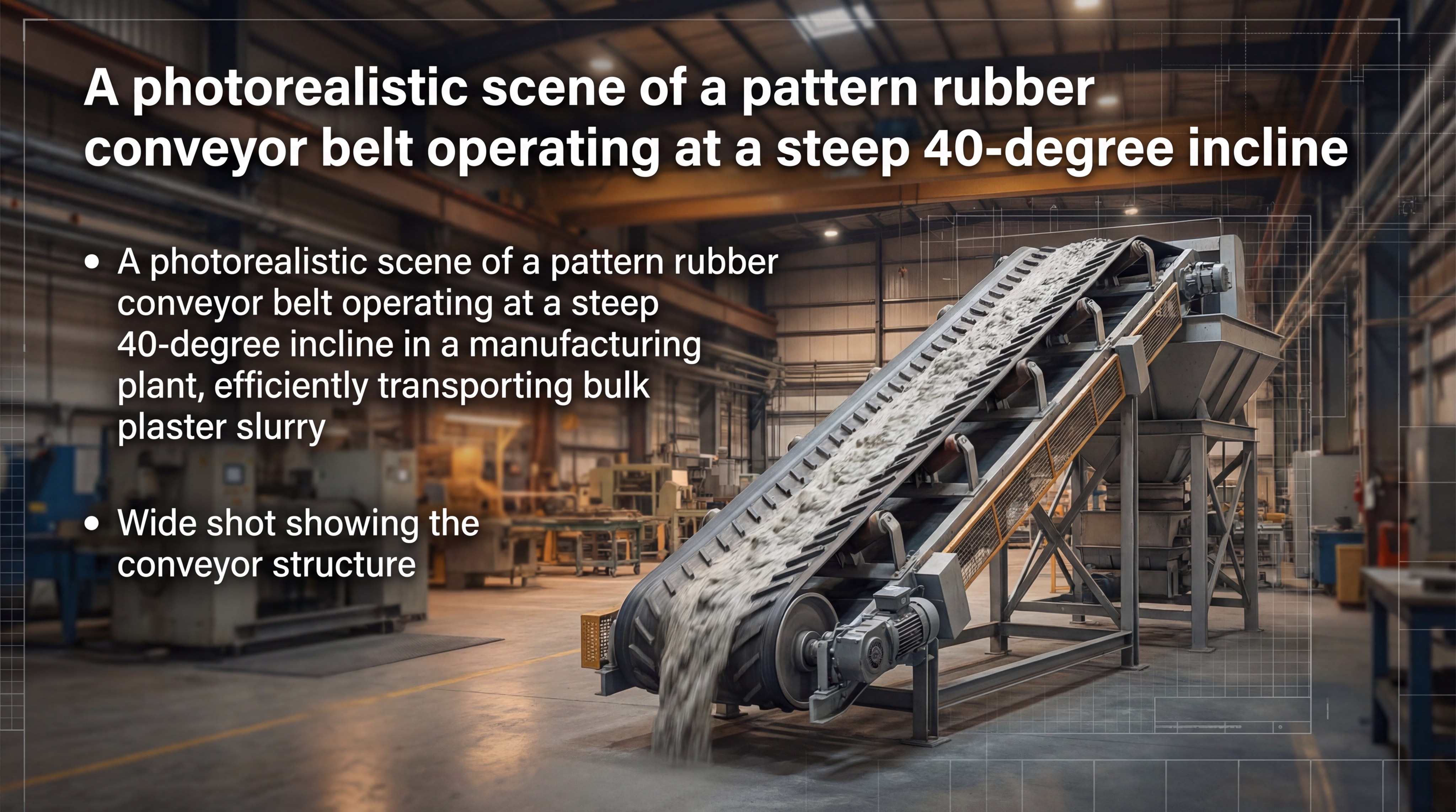 Wet plaster is notoriously difficult to transport because its low viscosity causes it to act like a fluid on smooth surfaces. The chevron patterns on these belts trap the moisture and solids together, preventing the “river effect” where liquid material flows backward over the moving belt.