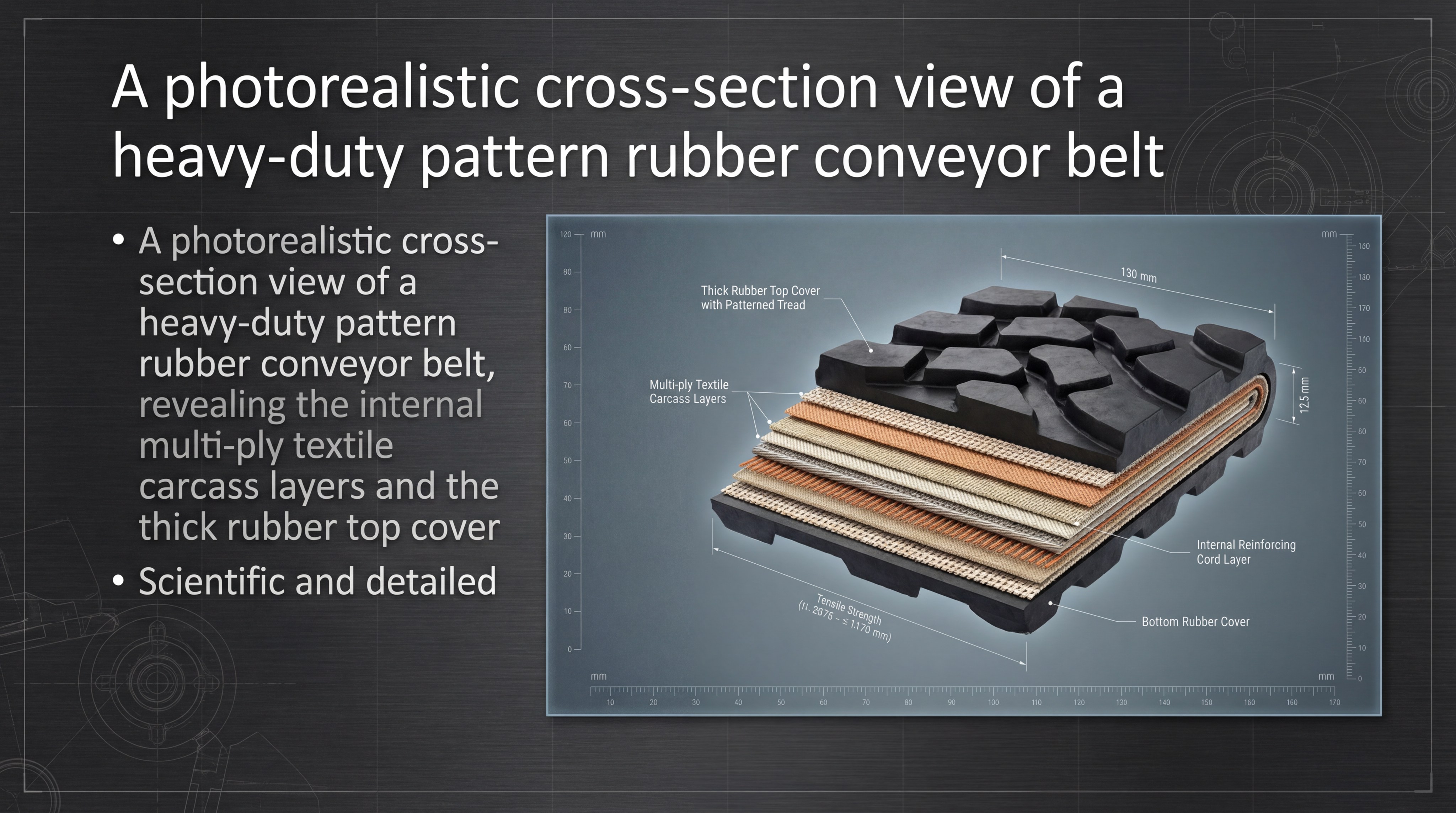 - Carcass: 2 to 5 plies of high-strength EP fabric.