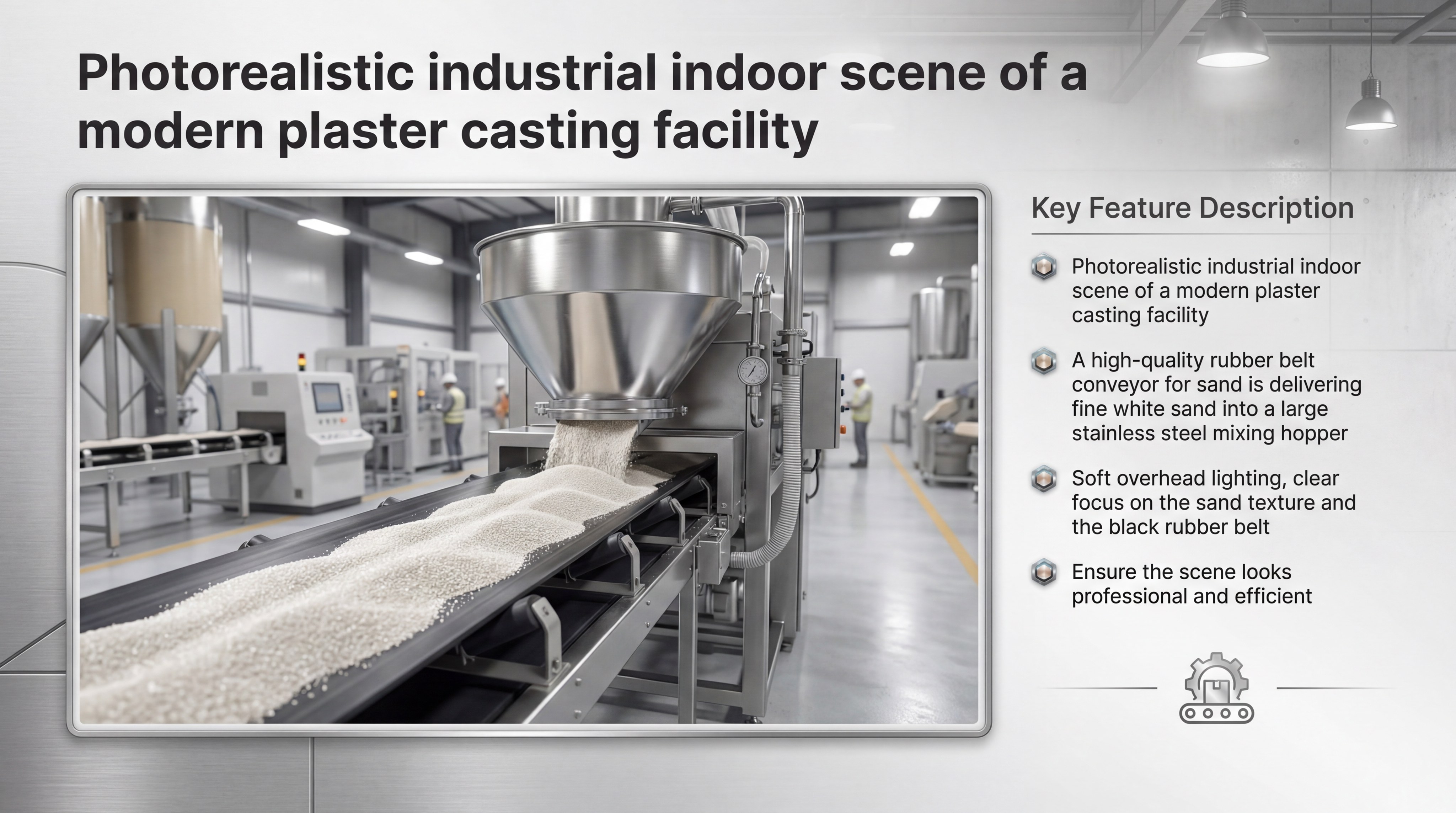 A rubber belt conveyor for sand automates material transport in plaster casting, reducing labor costs, improving efficiency, and ensuring consistent, high-volume production.