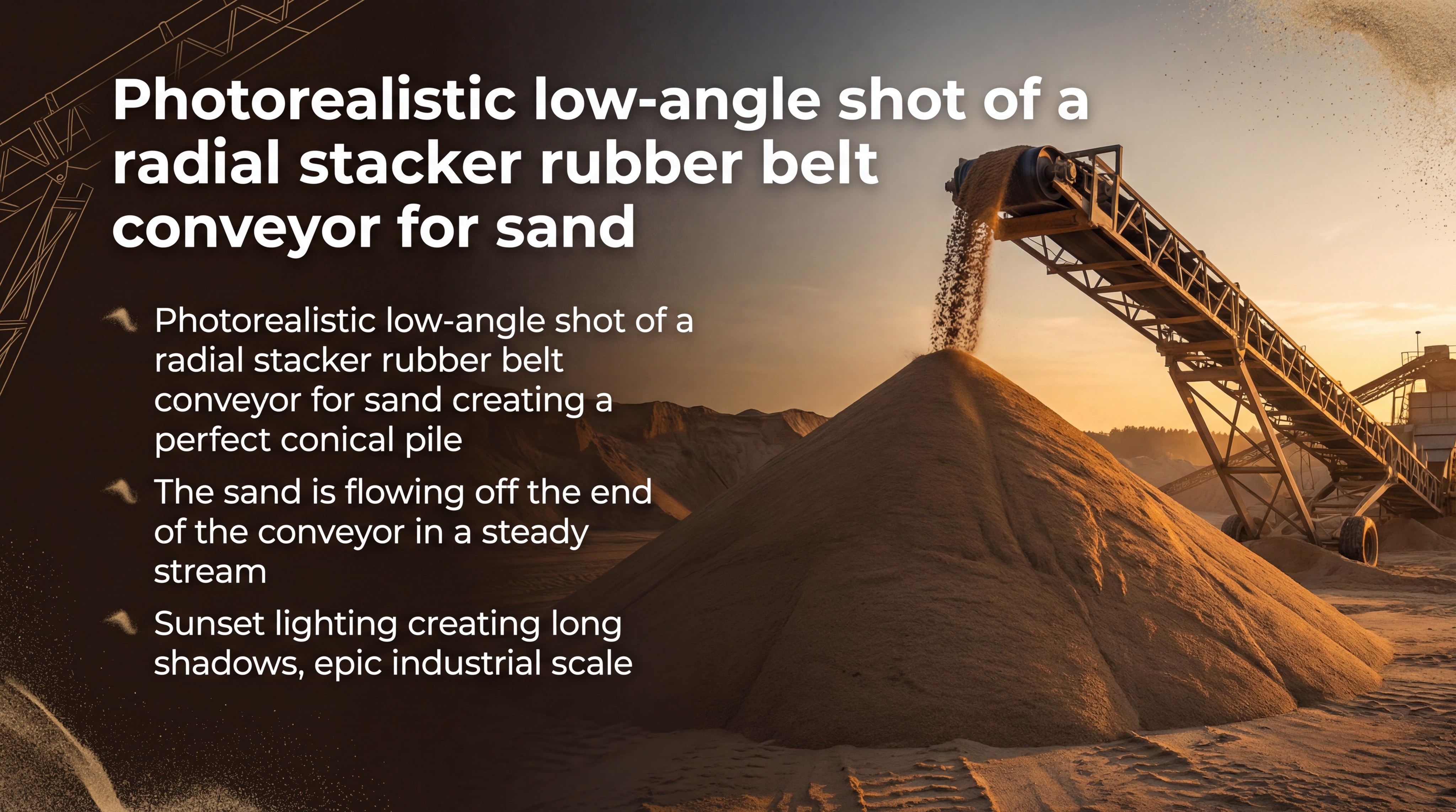 A rubber belt conveyor for sand handles bulk stockpiling by using radial stackers that create large, organized piles for easy inventory management. These stackers move in a semi-circular path to distribute sand evenly across a storage yard. You will find this much more efficient than using wheel loaders to build mounds.