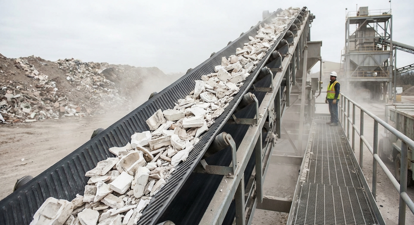What’s the best way to move broken plaster waste?A corrugated sidewall conveyor belt is the ideal solution because it contains the granular and clumpy waste, preventing spillage and minimizing silica dust.