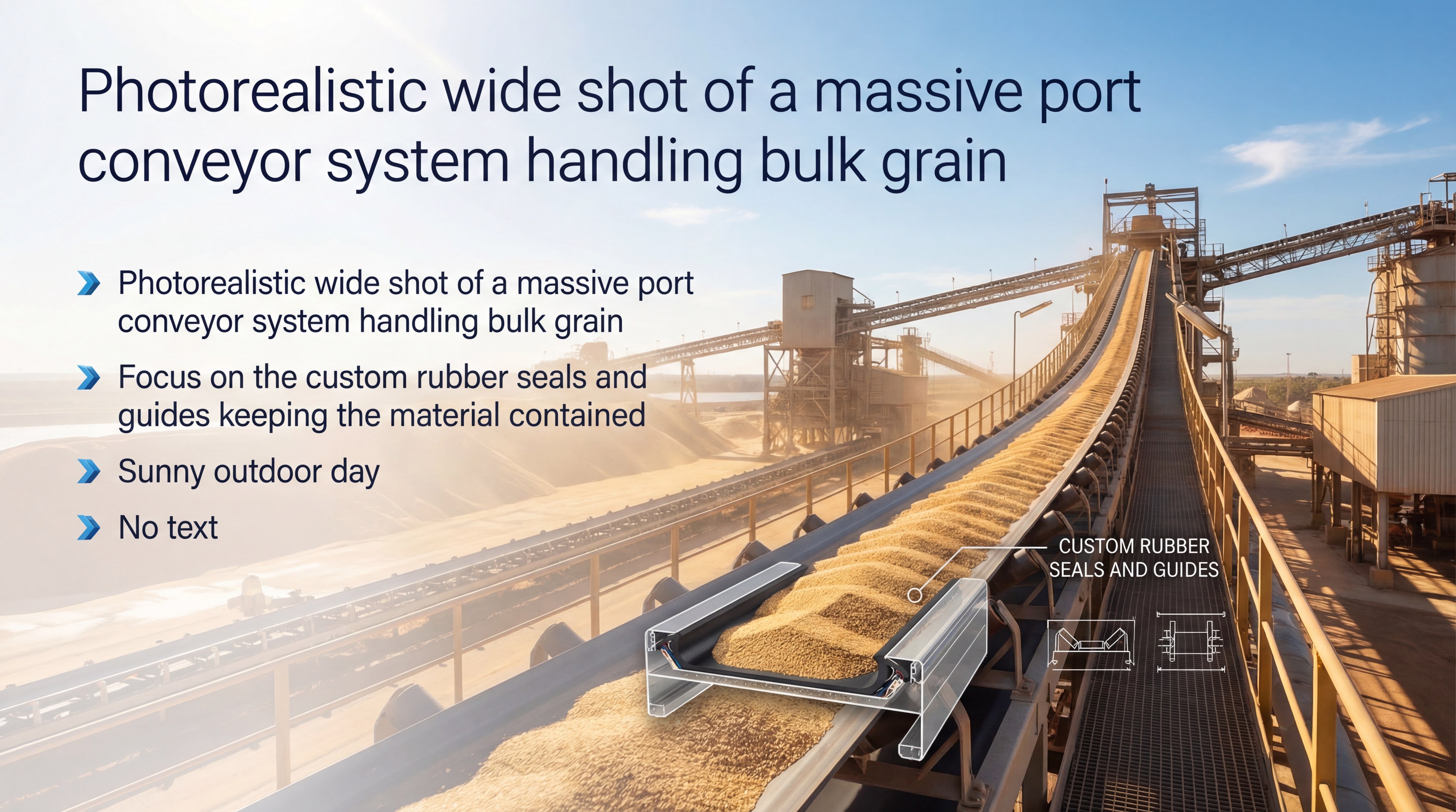 Grain is highly flowable and prone to escaping even the smallest gaps in a conveyor system. Custom rubber strips for grain ports are designed to provide a “zero-leak” seal at high belt speeds.