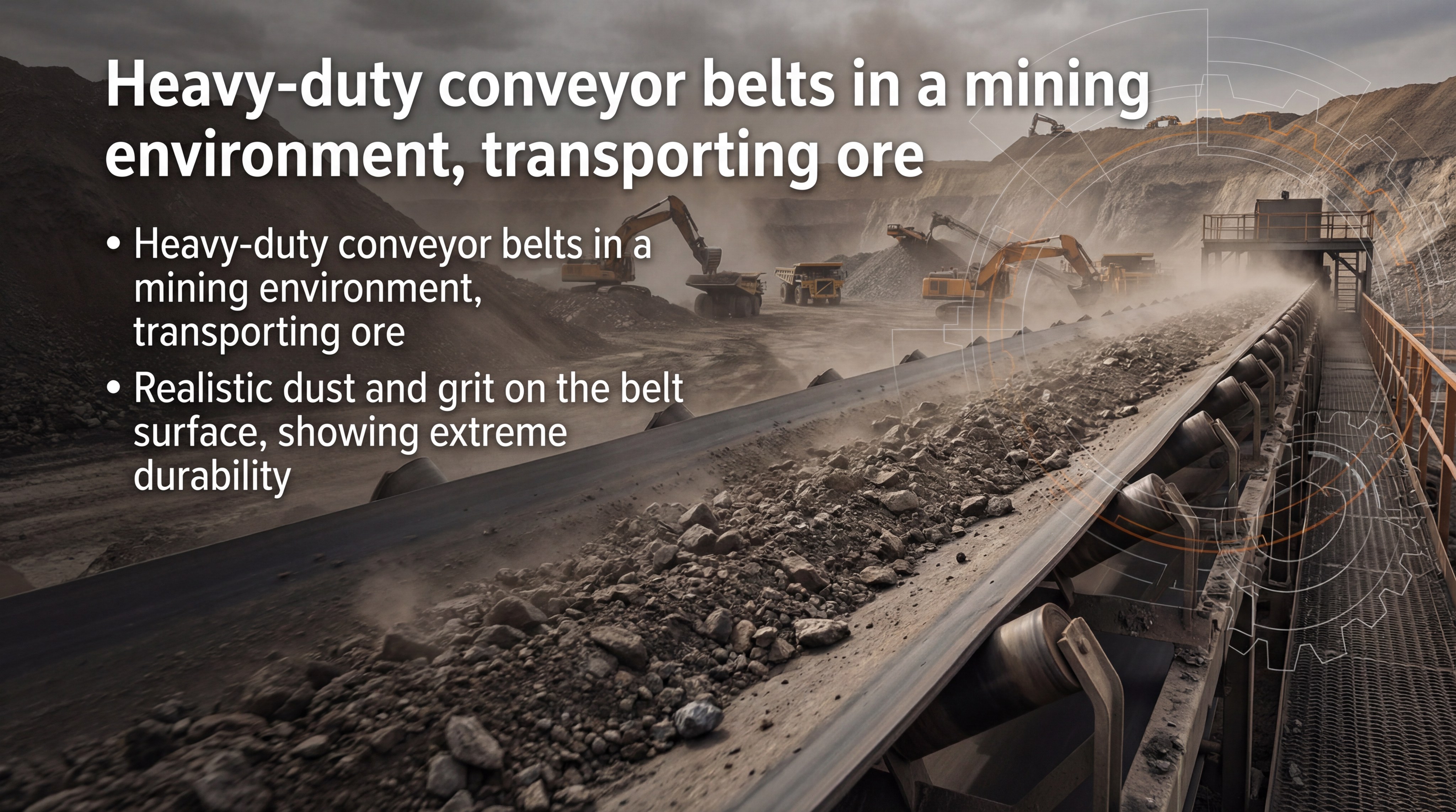 Key Takeaway: In the mining sector, the combination of steel cord reinforcement and high-impact rubber compounds is essential for moving heavy loads reliably across vast distances.