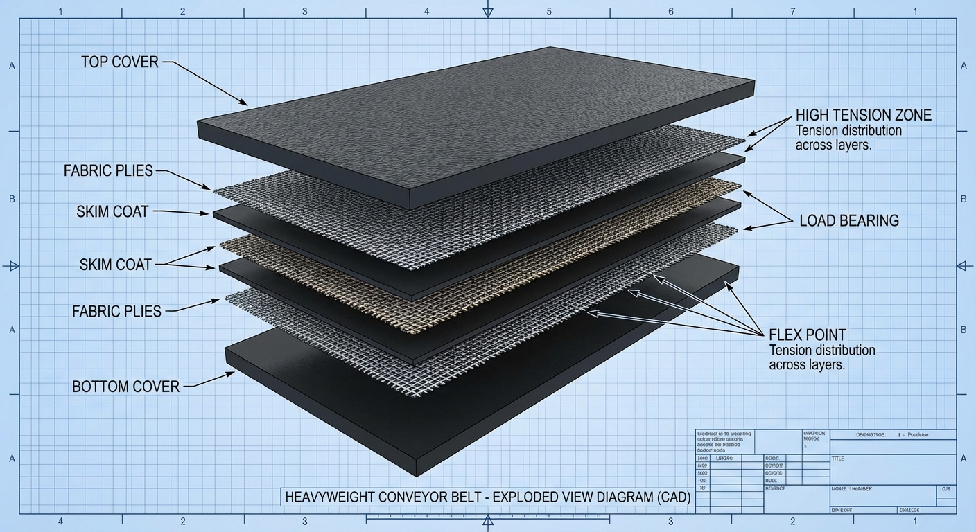 The carcass is the heart of the belt, using high-strength polyester and nylon fibers to resist stretching. These plies are layered to distribute the weight of the plaster molds evenly across the width.