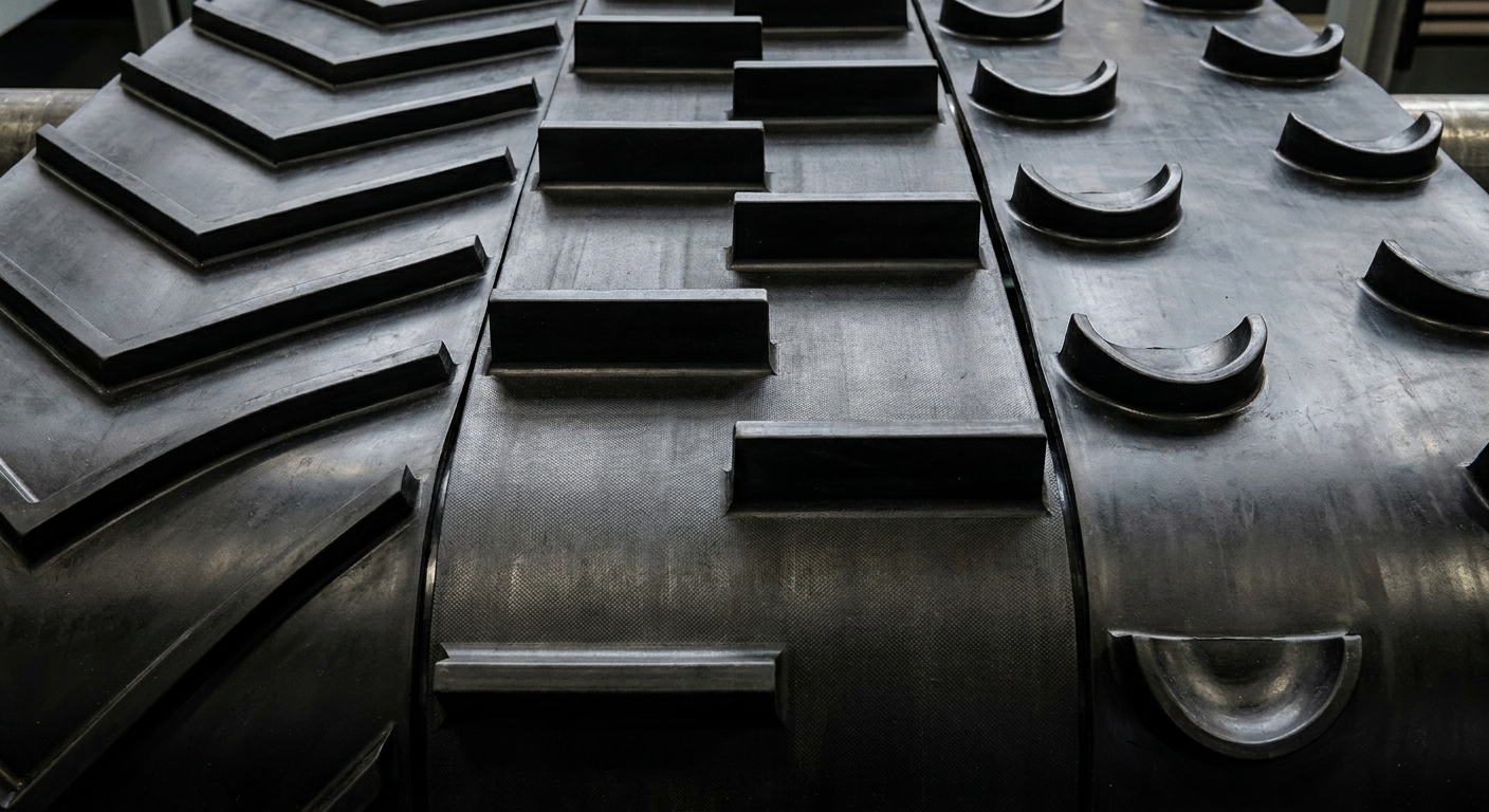 Chevron profiles are generally used for medium inclines and smaller materials like sand or wet plaster. For steeper slopes, aggressive T-cleats provide a deeper “bucket” effect to hold the load securely.