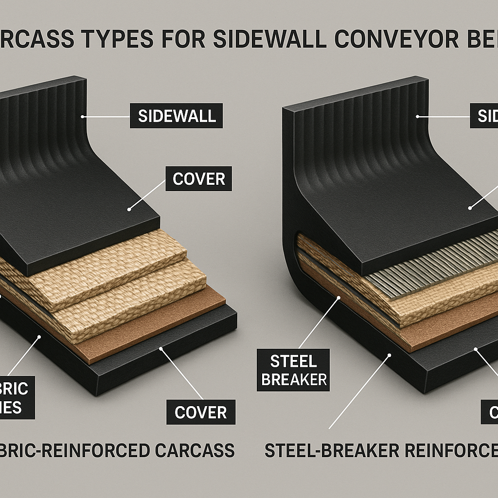 Key Takeaway: Carcass choice depends on load and belt width, with fabric for standard use and steel reinforcement for heavy-duty applications.