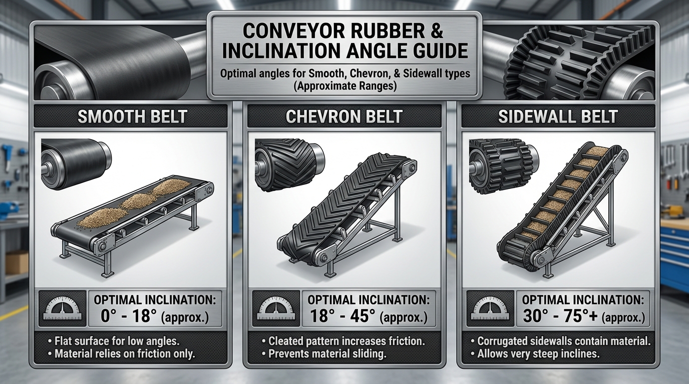 You stop material rollback by using belt conveyor rubber with a profiled surface, such as Chevron cleats or structured “Grip Top” covers. While smooth belts work well up to 18°, steeper inclines require mechanical grip to keep the material moving upward. These profiles are vulcanized directly onto the rubber surface to ensure they never peel off under load.