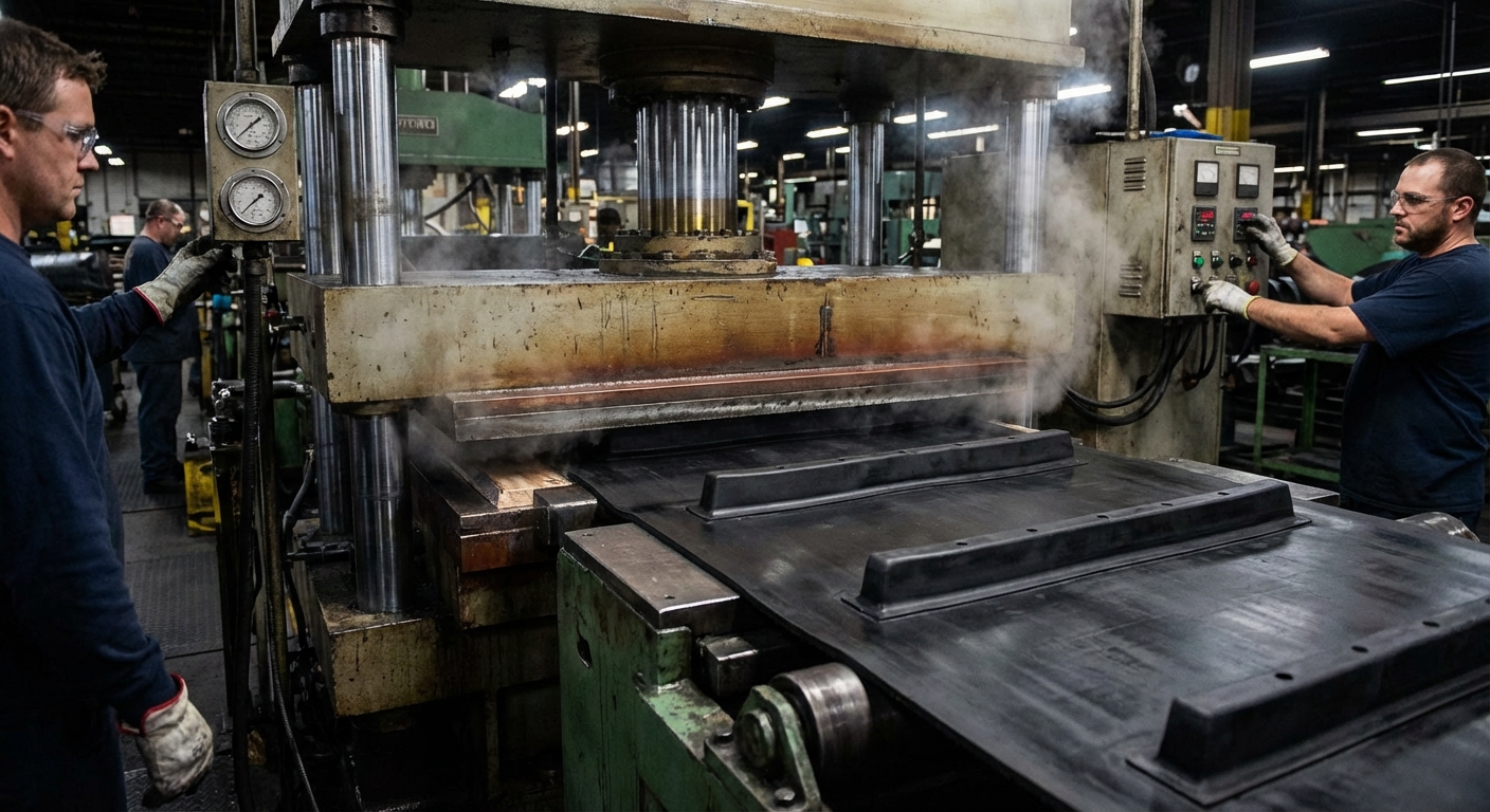 Pressure is applied to eliminate air pockets while heat softens the rubber compounds to a molten state. You must maintain this balance carefully to ensure the layers fuse without charring the delicate internal fabrics.
