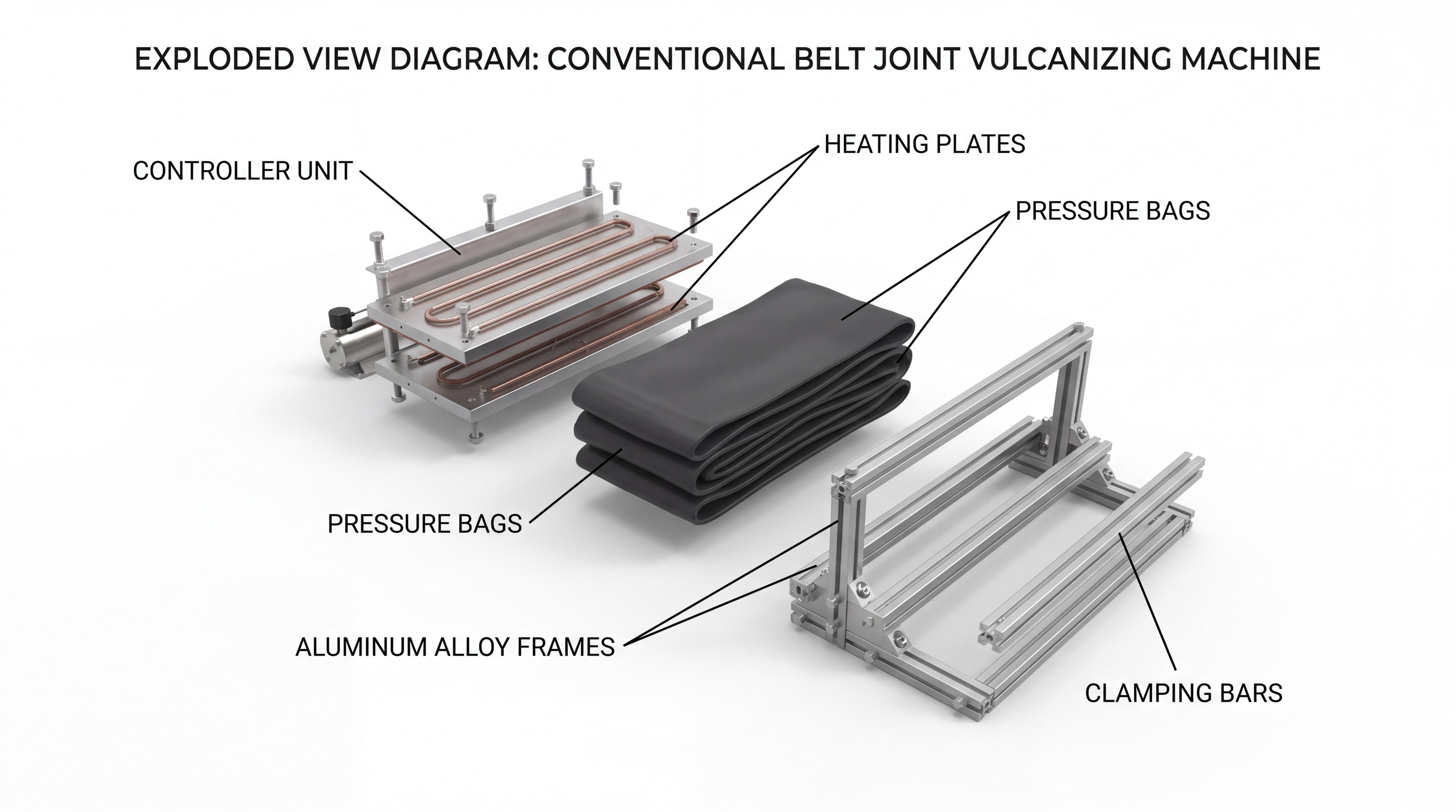 The core components include high-strength aluminum alloy heating plates, a water pressure plate, and an automatic digital control box. A conventional rubber conveyor belt joining machine is built using modular frames that you can assemble quickly on-site. These parts are engineered to withstand extreme pressures without warping or leaking.