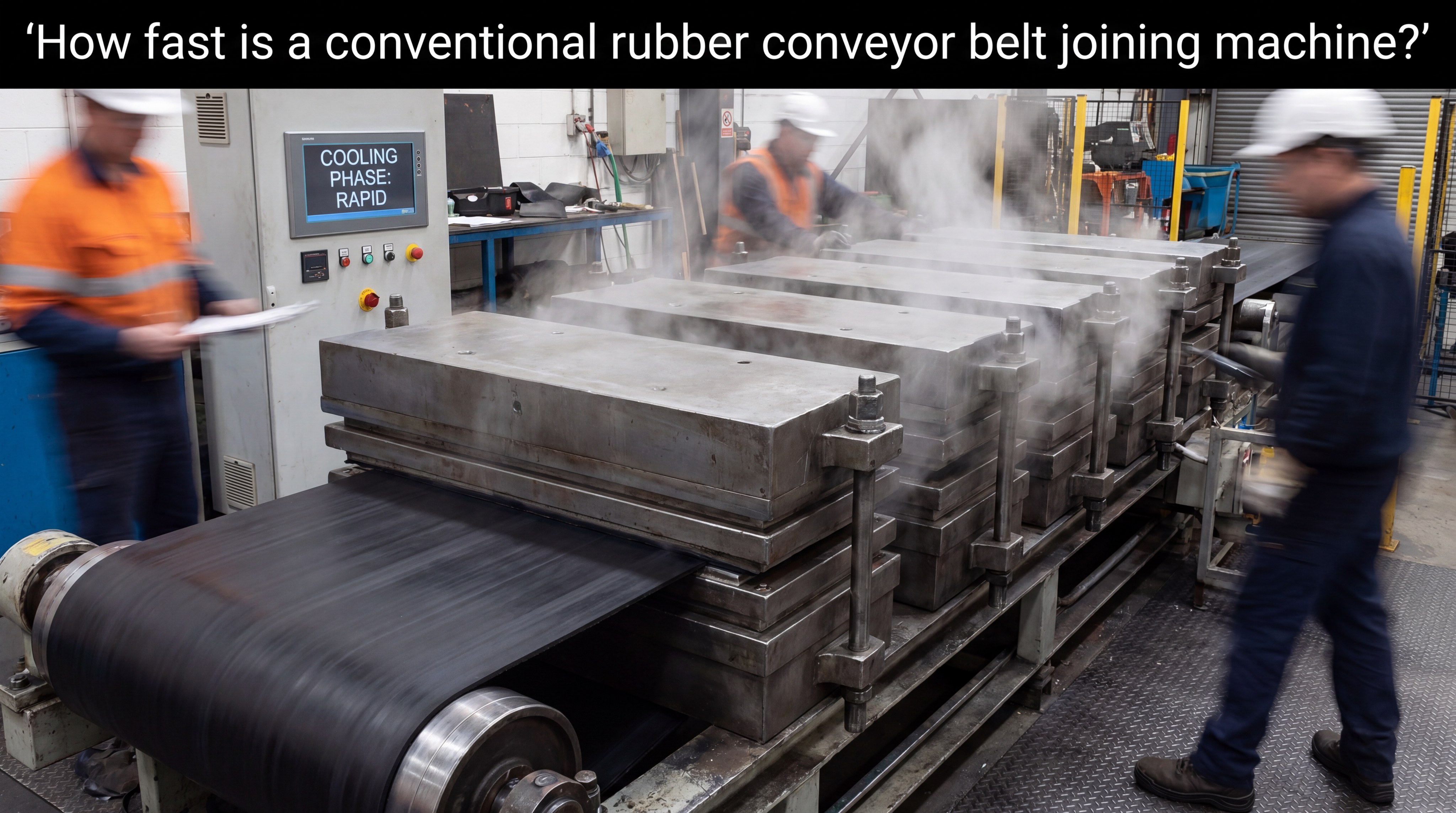 How fast is a conventional rubber conveyor belt joining machine?
