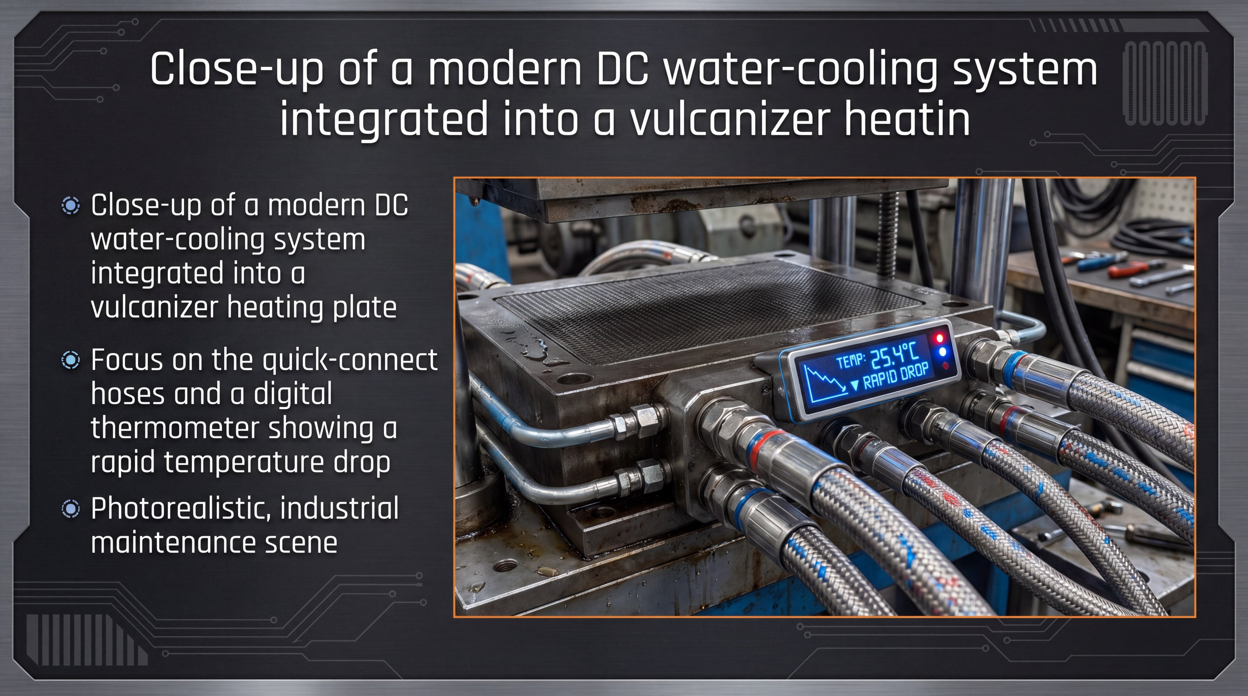 Instead of waiting hours for natural air cooling, a DC water pump forces coolant through the plates immediately after the curing time finishes. This rapid cooling stabilizes the rubber’s molecular structure faster, allowing for earlier belt tensioning.
