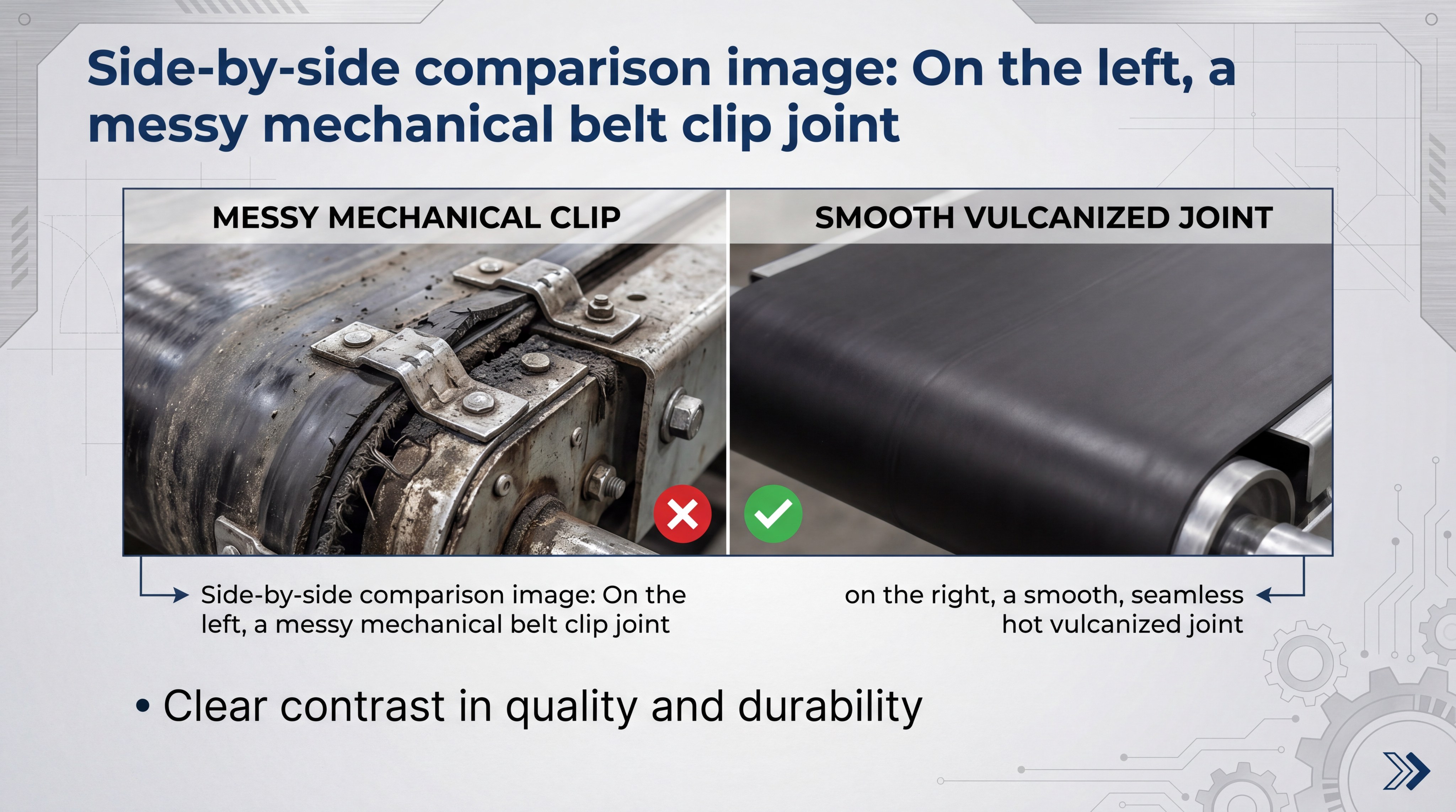 Key Takeaway: A smooth vulcanized joint protects expensive pulleys and scrapers from the impact damage caused by metal clips.