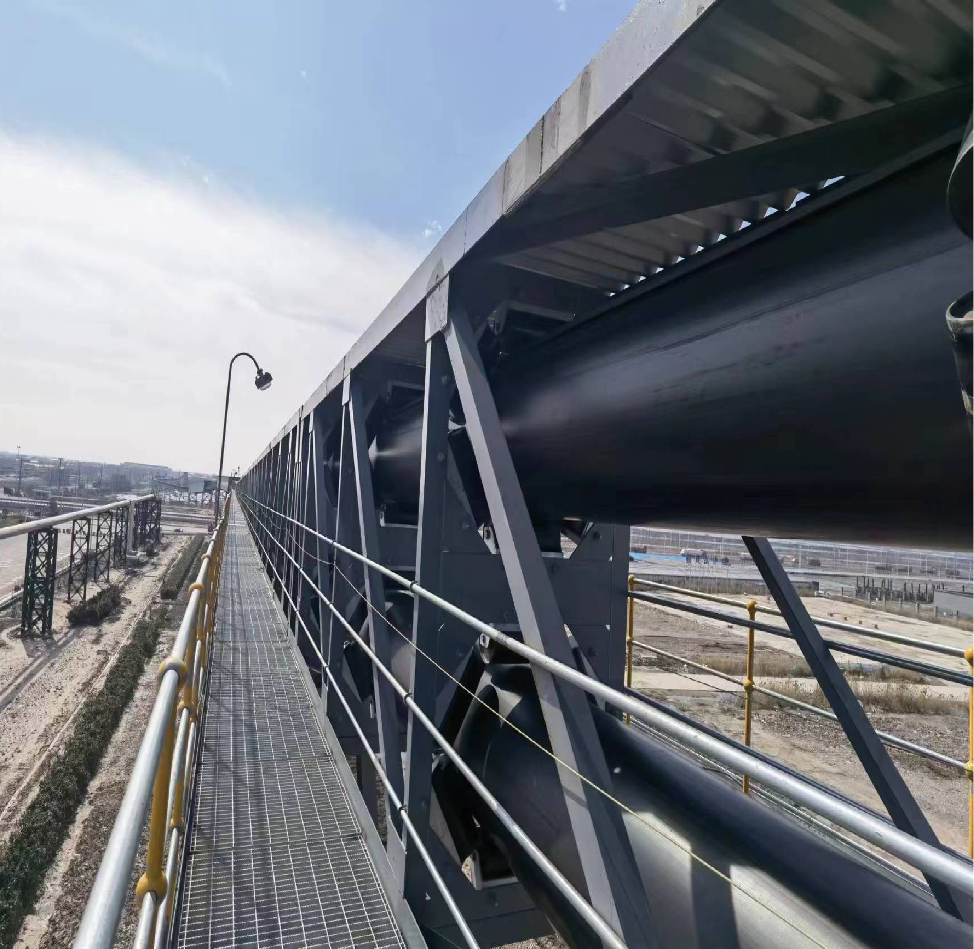 The pipe belt's tubular structure enables both vertical and horizontal curves, allowing the system to navigate around obstacles, cross roads, railways, and rivers without intermediate transfer points. This flexibility results in highly economical overall layouts with smaller curve radii, reducing land requirements and infrastructure costs.