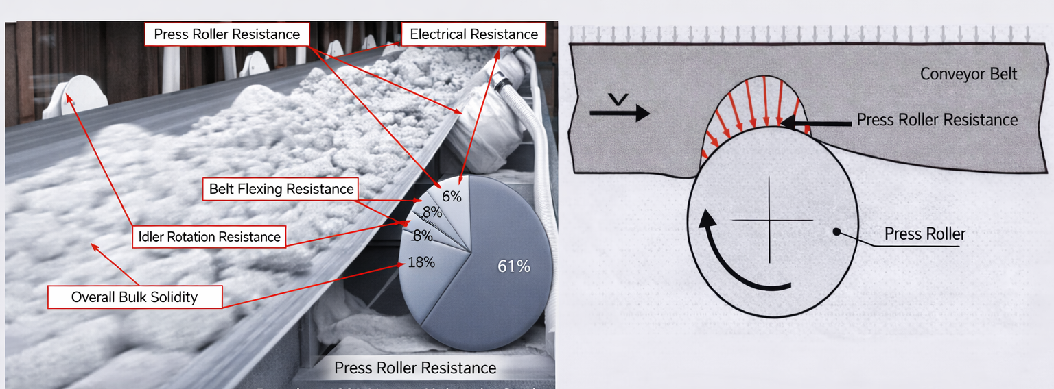 According to Hannover University research, indentation rolling resistance accounts for 61% of the total resistance during belt transport operation. The indentation rolling resistance of the belt cover rubber and roller interaction represents the primary resistance factor in conveyor belt transportation.