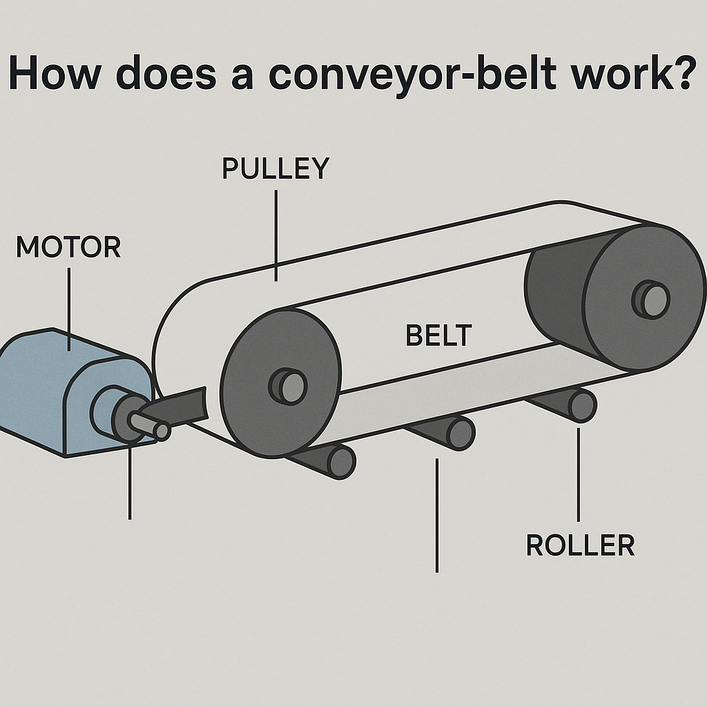 Key Takeaway: A conveyor belt is a mechanically simple system driven by a motor and pulleys, designed for efficient and continuous material transport.