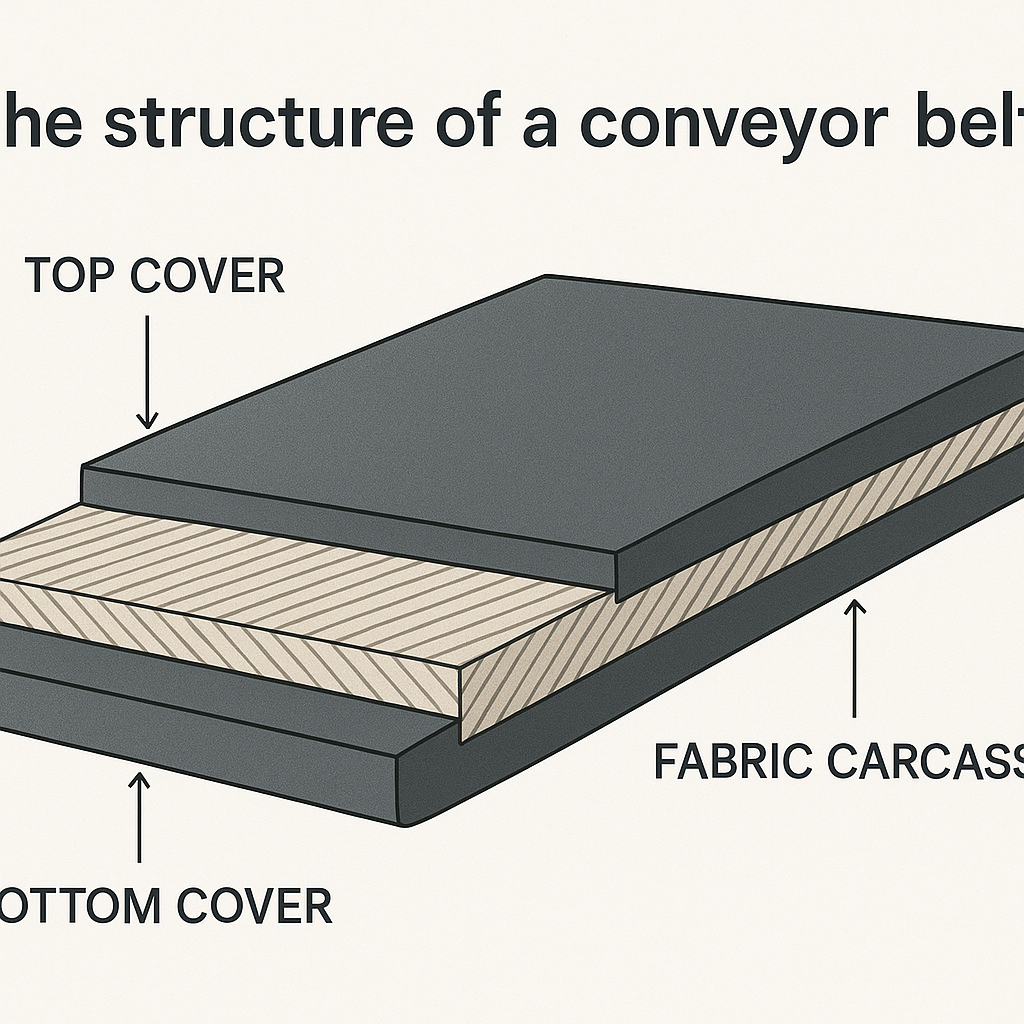 A standard conveyor belt consists of three main layers. The top cover is the contact surface, the fabric carcass is the core, and the bottom cover runs along the rollers.